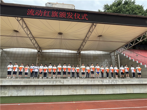 升旗仪式上,学校党委书记、校长杨鸿还为第十四周文明示范班级、文明示范寝室获得者颁发流动红旗。