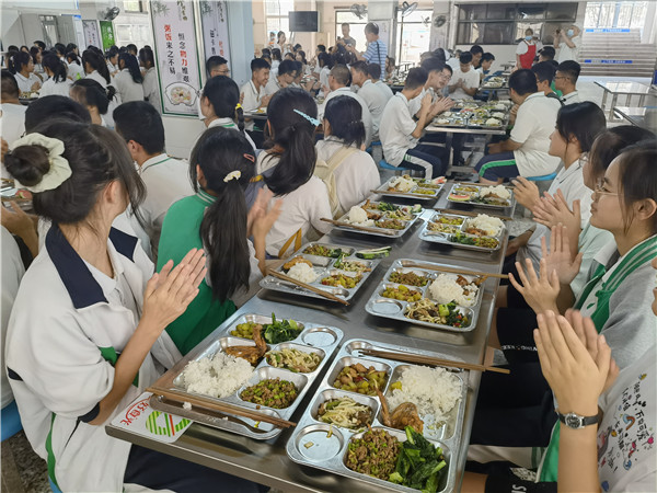 食物展台上盛放着色香味俱全、营养丰富的菜肴,每一道精心准备的菜肴都被赋予了特殊的意义,向即将参加中考的学生送上祝福:步步高升(高笋炒肉)、妙笔生花(宫保肉丁)、展翅高飞(卤鸡翅)、牛气冲天(烂刀牛肉)、满园春色(炒凤尾)、状元汤(南瓜汤)……无不寄托着对同学们的美好祝愿。