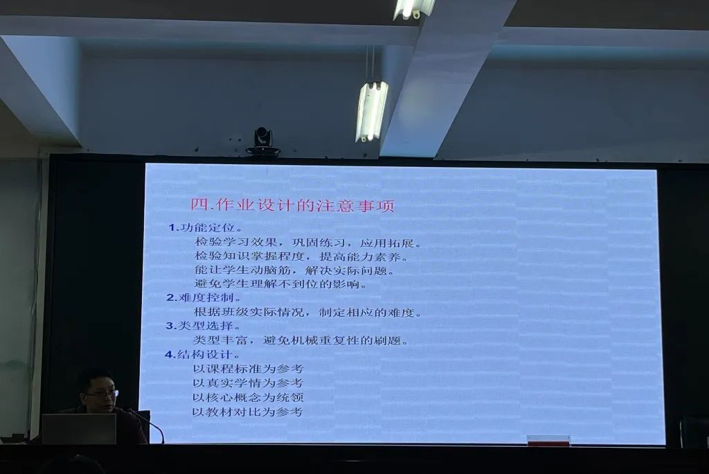首先,市七中第二教学部数学备课组组长、市七中唐毅卓越名师工作室领衔人唐毅老师解读了《作业设计》的具体要求。指出作业设计需要结合教学实际,解决课堂内外出现的典型问题,强调了作业设计的注意事项。
