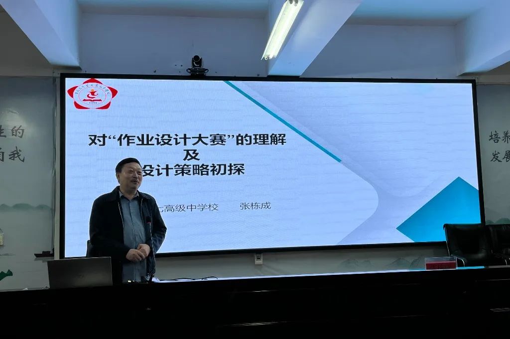 然后,市七中第一教学部备课组组长、市七中赵建旺新秀名师工作室领衔人赵建旺老师针对《作业设计》中的操作策略分享了自己的思考。赵老师展示了优秀作业设计的案例,详细阐述了每一项内容的呈现方式,同时提出,在课前、课中、课后作业的设计中应遵循总体性作业设计的原则,前后关联一致且具有层次性。